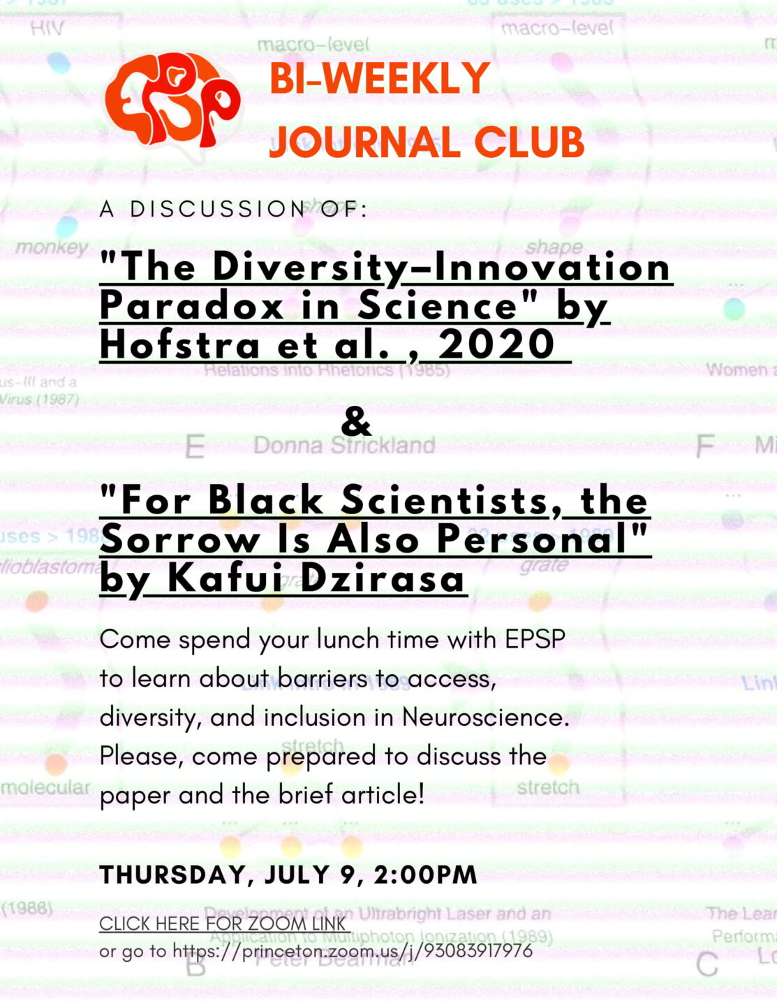 Every two to three weeks, our journal club facilitators critically assess literature that ignites dialog about barriers to access, diversity, and inclusion. Our journal clubs aim to create spaces that highlight the systemic flaws of our academic communities and the harsh realities of the world we live in.